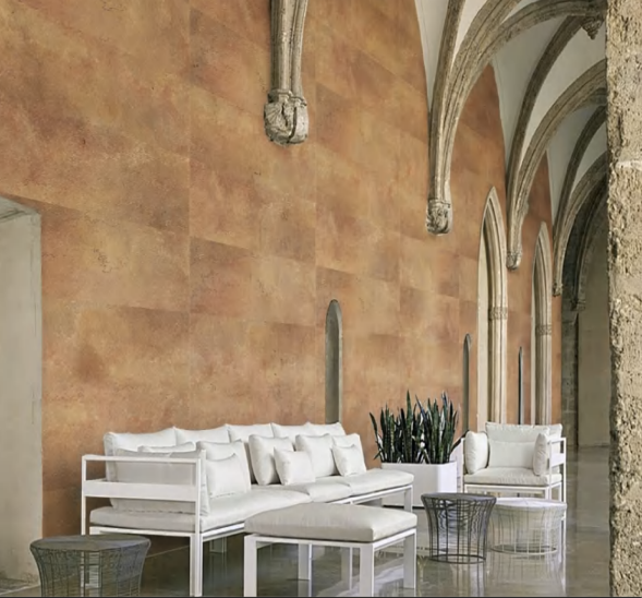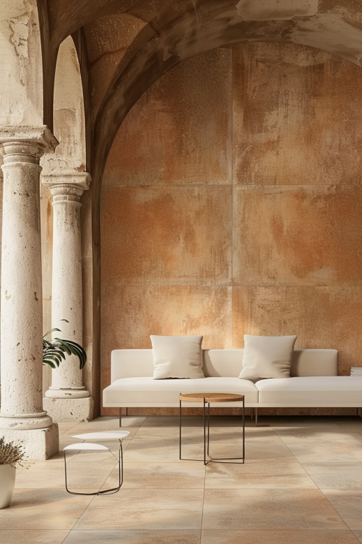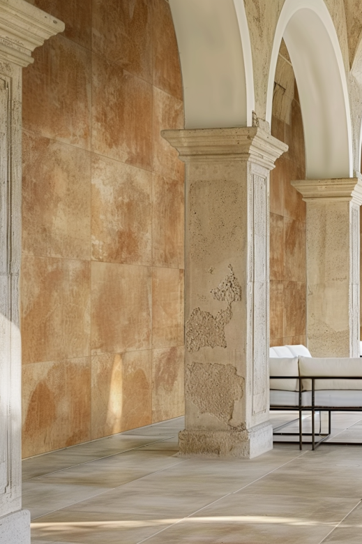 Warm Sunset-Glow tones with organic iron-stone textures, blending neoclassical arched motifs with contemporary minimalism. Ideal for luxury villas, hotels, and cultural spaces seeking timeless sophistication and understated luxury.